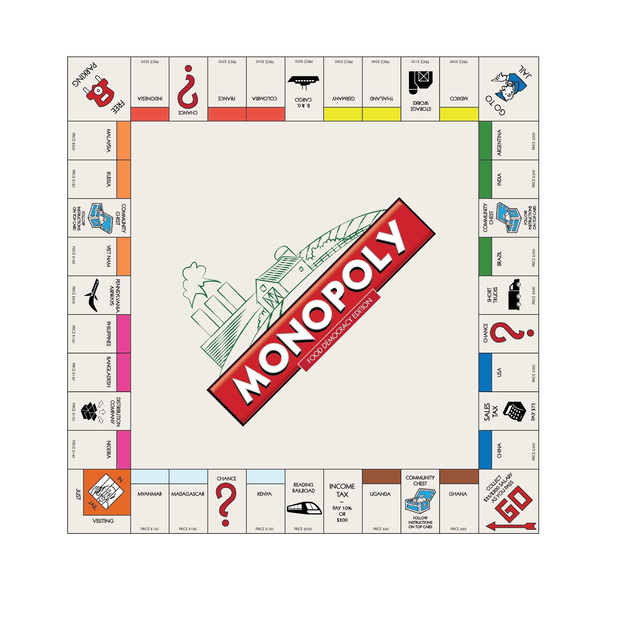 The way I’ve chosen to communicate my topic is through the popular game of Monopoly. To me this seemed an appropriate use of the game, as the idea is to buy land and bankrupt other players, which is the favoured approach by Agribusinesses’ and large companies as they and their stakeholders priorities money and profit over community health and wellbeing.