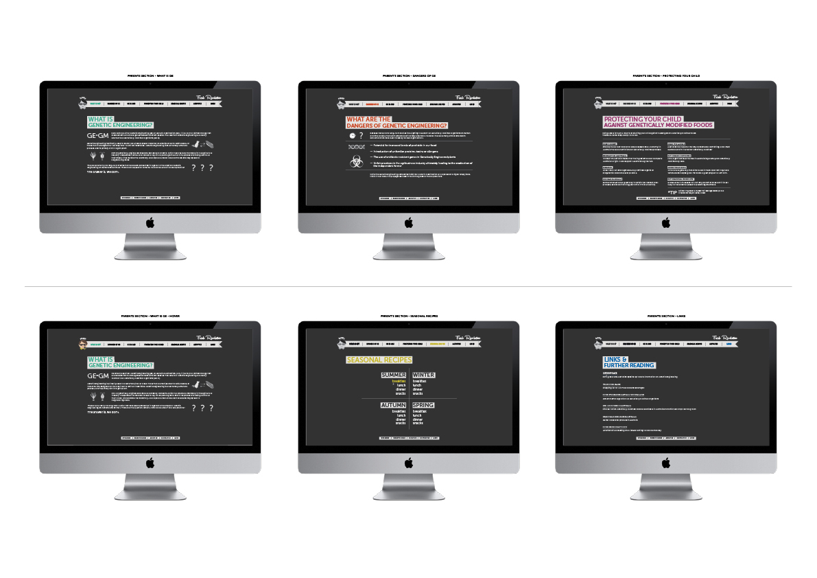 In my work I have decided to use a friendly and non-confrontational approach to the education of issues such as Genetic Engineering and corporate control, which is appropriate to my target audience (young children and their parents). While these issues have the potential to insight passionate responses, I wanted to introduce the concept of food democracy in an easily accessible and non-confrontational manner. My campaign aims to create awareness of the problems with our global food supply chain, and to be the catalyst for parents to begin their own research and exploration of a new way of thinking about food. For children of a young age, my aim is to plant the seed for a different kind of global food future, to counter-act the bombardment of advertising on today’s children. There are three parts to my outcome, posters, a flyer and a website. The four posters are specifically for young children, and are designed to be displayed in primary school classrooms and other educational environments. The flyer is a take-home flyer to be given to children to take home to their parents, or directly to parents themselves. The front side gives parents a small snippet of the issues and dangers of Genetic Engineering, whilst the reverse side provides a colourful illustrated recipe suitable for young children to make with their parents – aiming to spawn an interest in cooking and using fresh ingredients rather than processed ones. The most substantial part of the outcome is the website, which is divided into two separate sections – one for parents and the other for children. The children’s section is an extension of the posters and the recipe containing interactive games and information about fresh food. The parent’s section contains significant information regarding genetic engineering, the dangers of such, its presence in Australia, how to avoid it, and further links to appropriate sites.