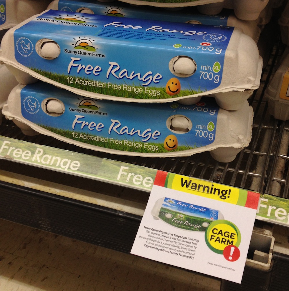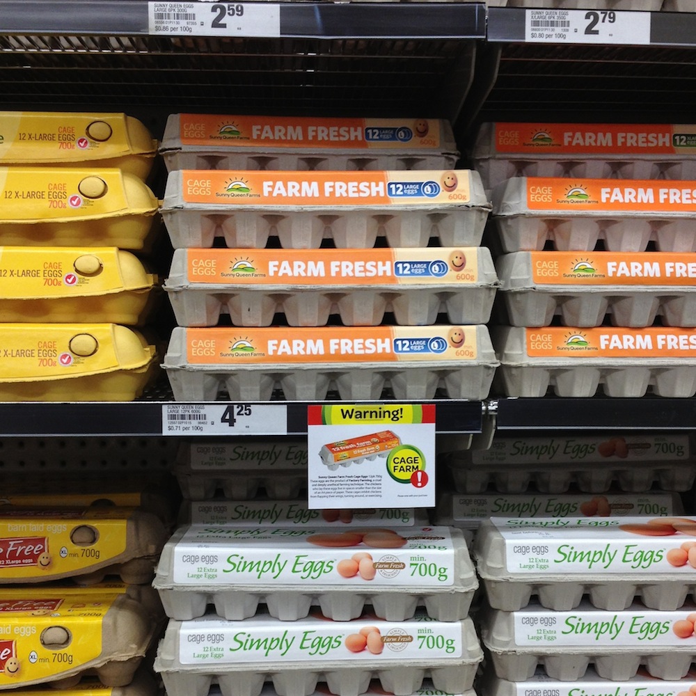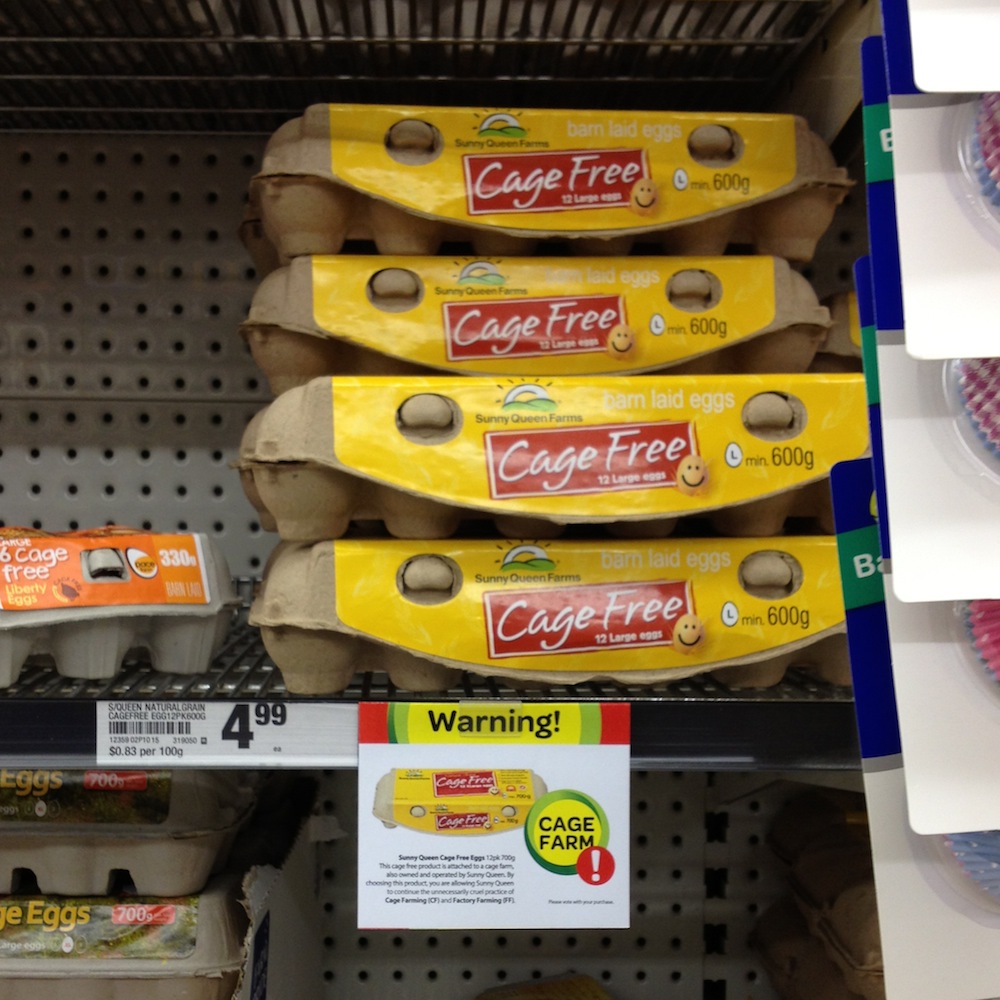 I created a culture-jammed communication system inside Woolworths shopping centres, whereby I targeted the 'victims' of brand faith who blindly buy goods that masquerade as 'wholesome'. I chose eggs in particular because of the inhumane practice of factory farming cage eggs, and the fact that, despite there being other more ethical ways of farming eggs, this atrocious practice goes on. Despite the consumers good intentions in buying "free range" or "cage free" eggs, one is almost always purchasing eggs from a corporation that actively supports the practice of factory farming.