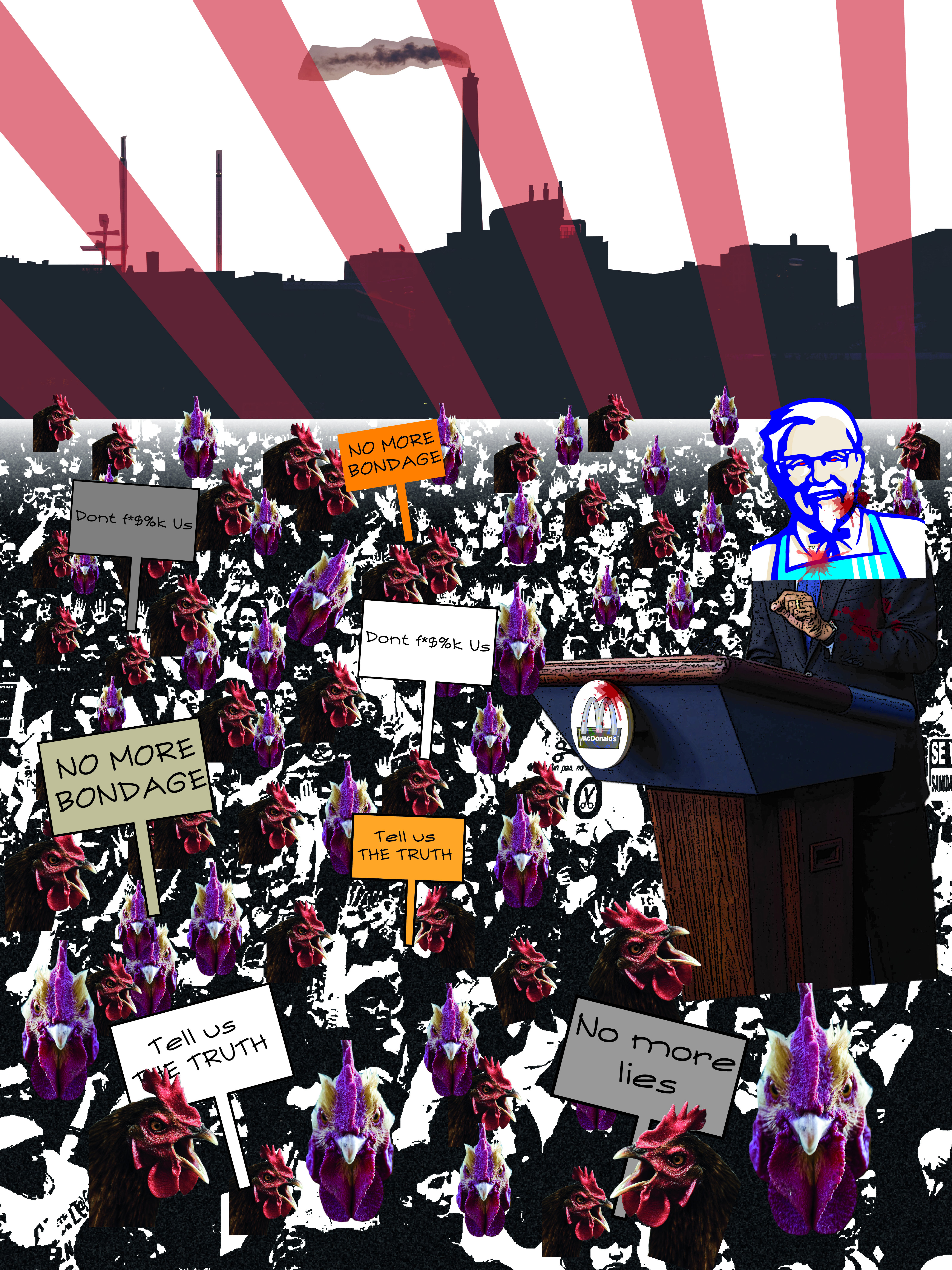 In a paralel world, they do have voice and reclaim their rights as animals. They don't want to be part of a farce, because they are tired of Mr. Kentucky and friend's lies about "a perfect life in a farm" There are a lot of missing chicken that accept the offer of "a perfect life" and never came back. Now they want justice and made a boycott.