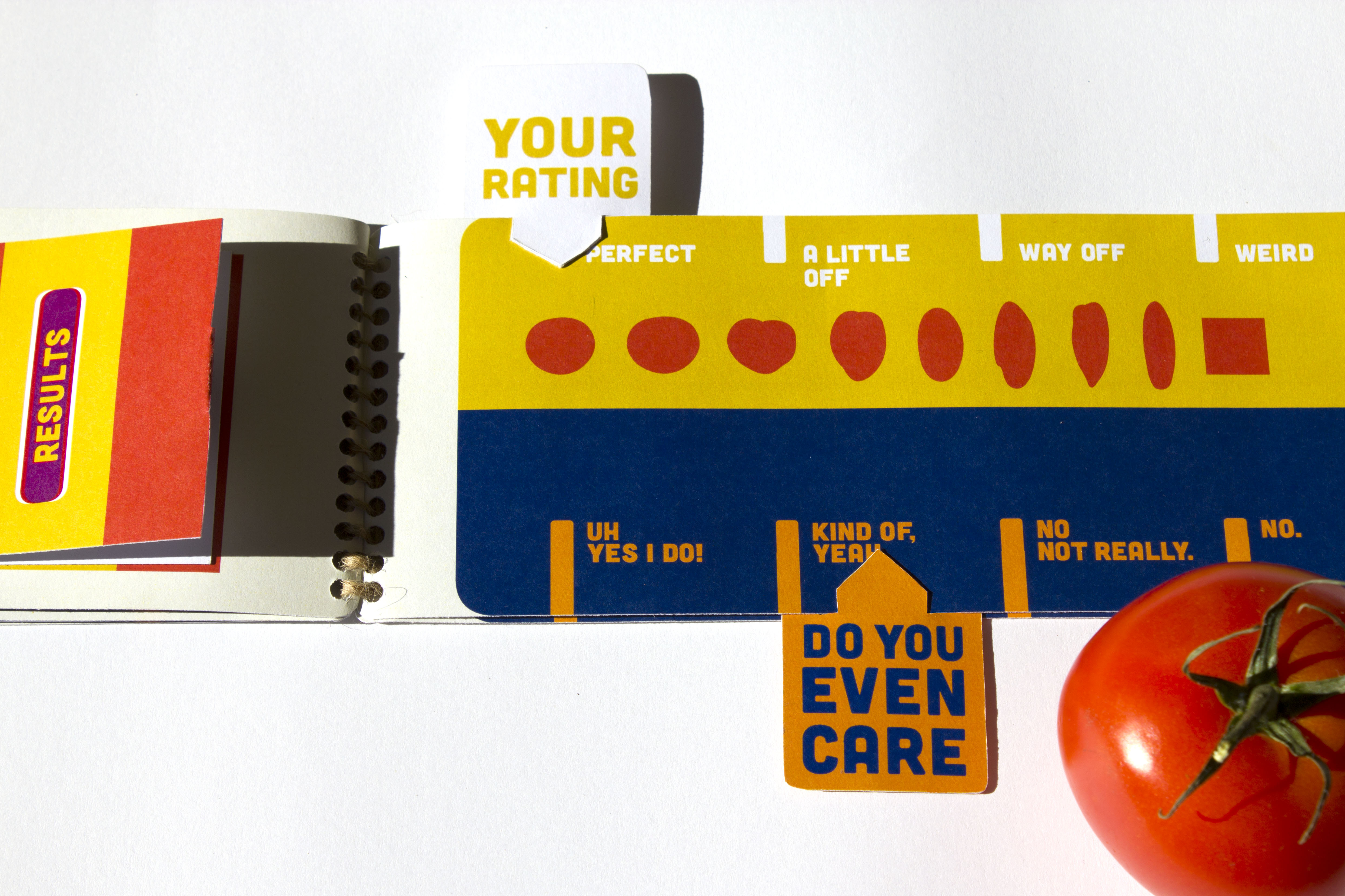 tomatoes. My design asks users to investigate the sensual characteristics of their tomato and question what it is lacking and why. Through applying the tests and reading the information provided, users gain insight into