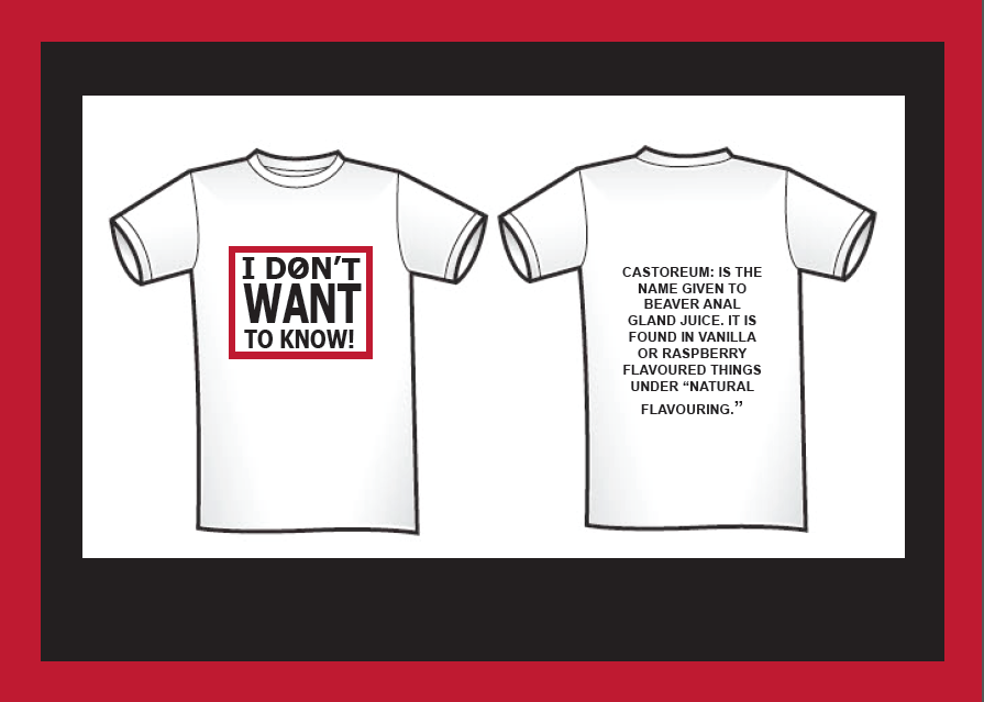 My concept has not had an affect on the media. However, in the process of this project, I put the T-shirts on people and got them to walk around in public spaces. You could see people would engage with the T-shirt and some people would come closer to read it. One of the locations we walked into was a coffee shop. The T-shirt on display at the time was the one featuring the fact; Castoreum, is the name given to beaver anal gland juice. It is found in vanilla or raspberry flavoured things under "natural flavouring". One lady read this, looked at her coffee, and then looked at us and asked if it was true. I said, "Yes it's true! It's pretty gross hey!". She said, "I have vanilla in my latte at the moment. I don't know if I want to keep drinking!" It was pretty awkward, but funny at the same time. The thing is, I don't know whether that lady finished her coffee or not, and I don't know whether it made her think of what else she doesn't know, but I do know that she will remember that moment, and she would tell that story to her friends and family. If it didn't change her opinion, hopefully it changed one of theirs.