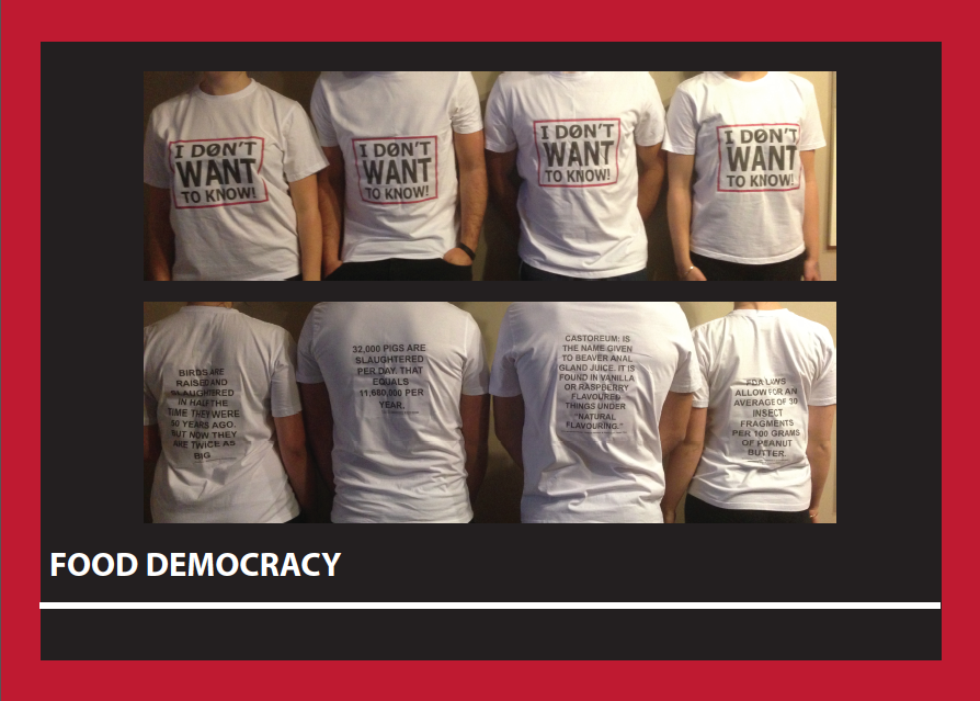 My concept will be applied to a T-shirt, on the front it will say "I DON'T WANT TO KNOW" and on the back will be a fact about food or the production of food. It is suppose to represent that even though some people chose to ignore the information or in other words "turn their backs" to it the facts stay the same and follow us everywhere we go. Just because we choose to ignore the facts, that doesn't change them.