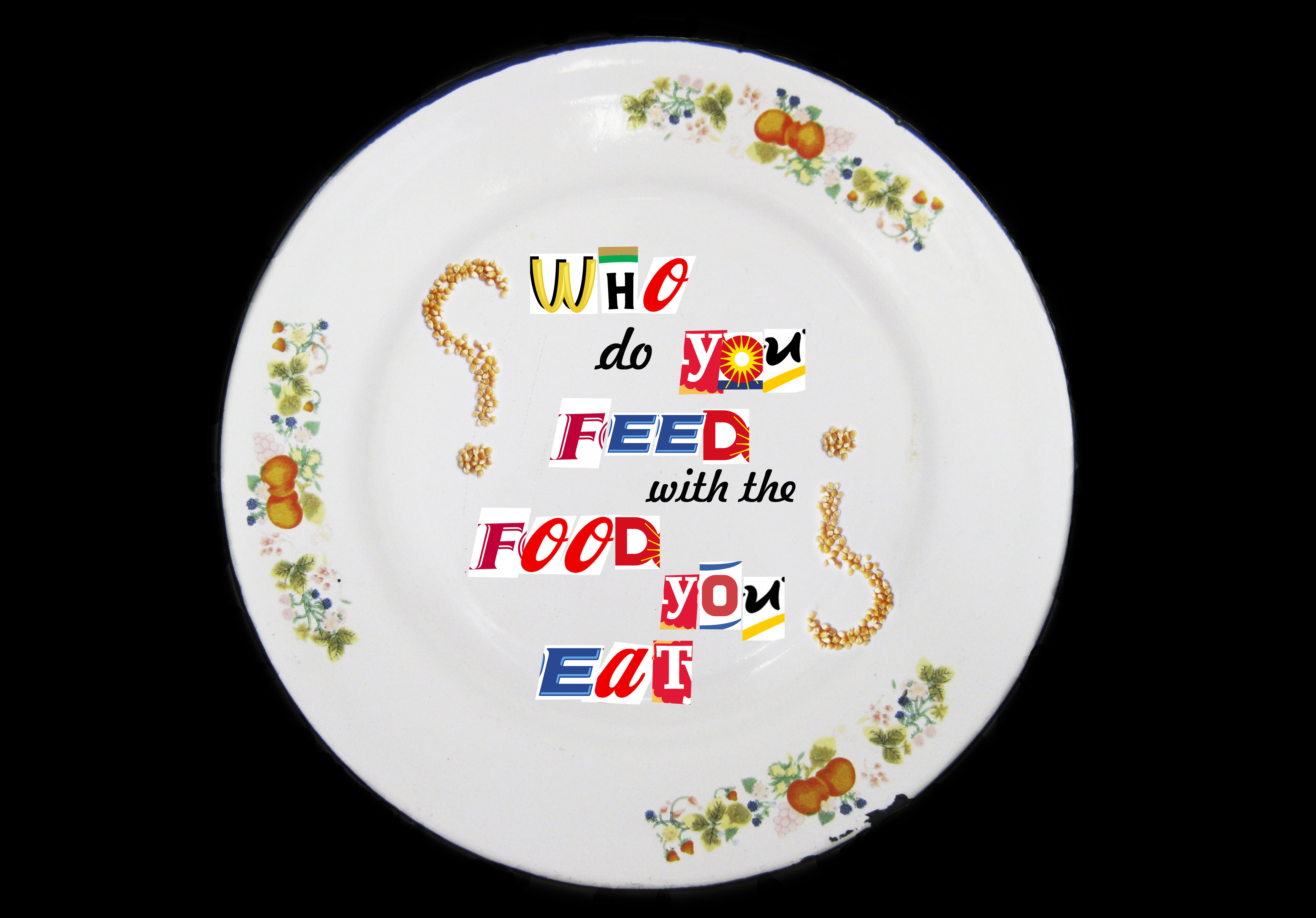True the question ¿Who do you feed with the food you eat?. The questions marks are made of corn seeds as a metaphore and protest about the uncertain fate of the agricultures, farmers, and country size people. The idea about this question marks done of this seeds is to make emphasis about ¿how uncertain is the job for farmers and country size people ?