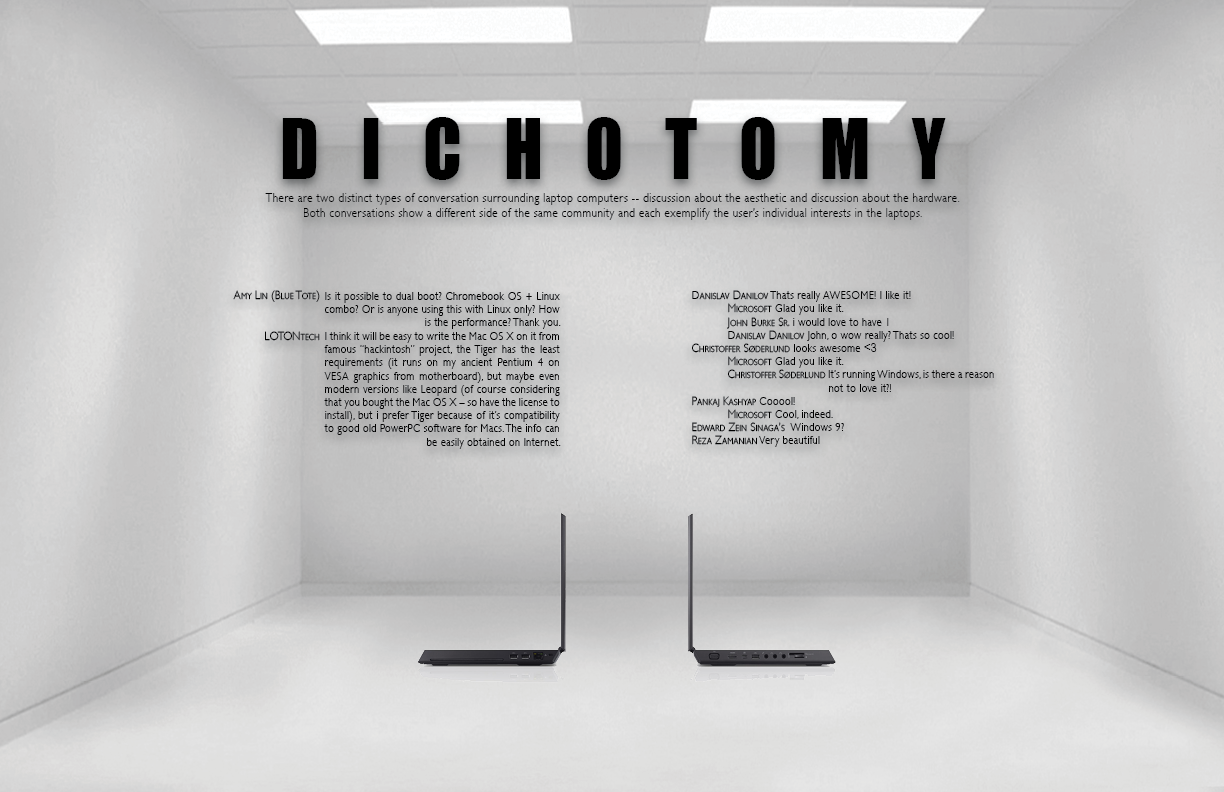 I was analyzing the community conversation surrounding laptop computers. In studying the discussion there, I noticed two major factions in the community -- people who were interested in the computer's aesthetic and people who were interested in the computer's hardware and functionality. Though these two groups were wildly different, they each sustained discussion and did not adversely effect each other. I wanted to show the difference between the two sides of the same community.