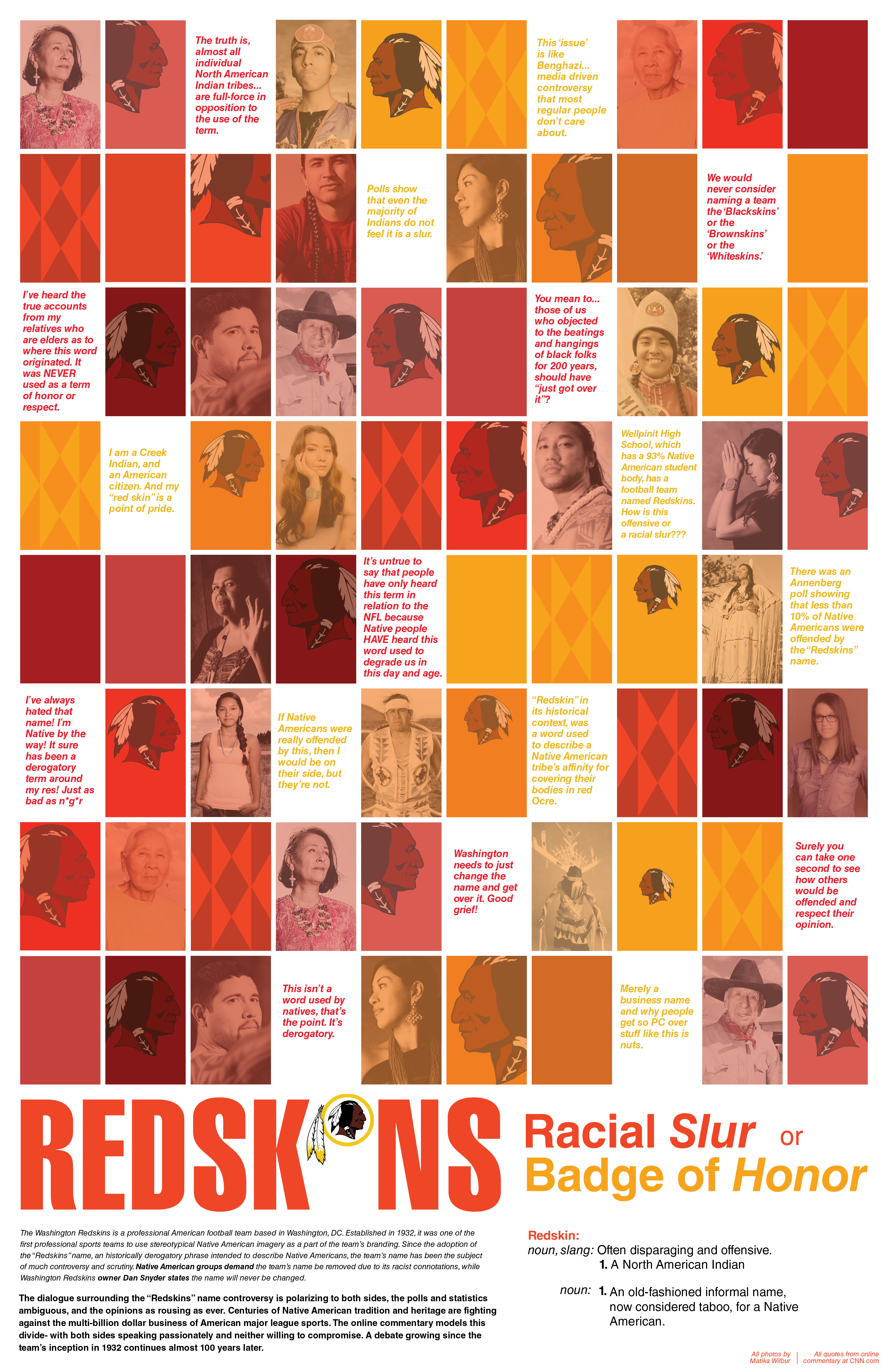 The “Redskins” controversy has sparked heated discussions, in online dialogue in particular. The conversations online are passionate, unfiltered, and disjointed. The incendiary subject of this dialogue is polarizing, oftentimes with neither side willing to compromise or attempt to empathize with the other. The commentary surrounding this issue is indicative of the anonymous, distant, and isolating nature of online dialogue today. In this poster I attempted to address both the failure of the online dialogue, and promote the potential beginnings of a successful dialogue about this divisive issue.