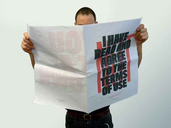 Even though I knew that digitally it had the potential of achieving higher audience, I opted through the path of print design. In "I have NOT read and agree to the terms of use" the simple change of media proves itself as a strong rethoric device. In this case, just using type was a direct response to how terms and conditions are designed. I considered alternatives such as creating more user friendly approaches (such as illustrated infographics) but I felt that type by itself would be interesting enough.