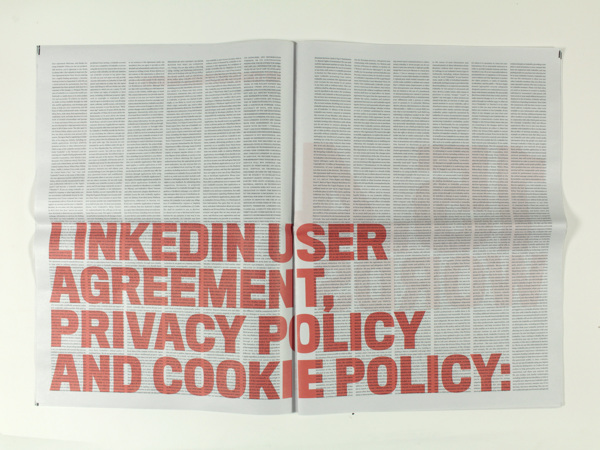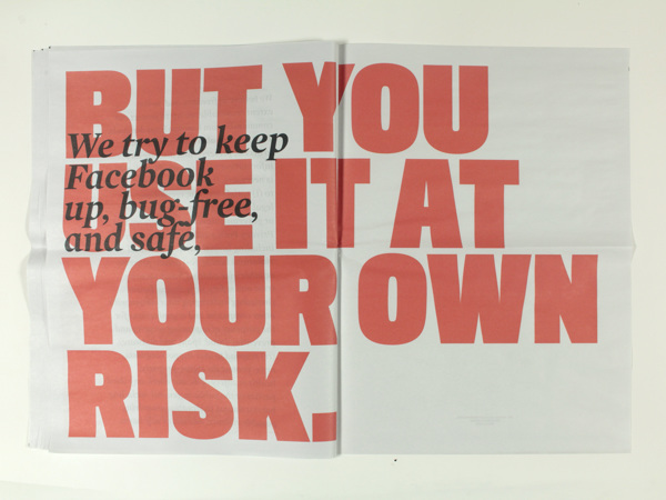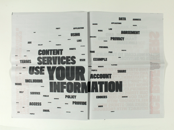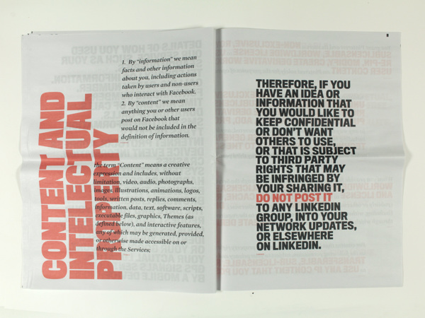 It's a newspaper that has the aim to make explicit the content inside top 6 social network's terms of use. Project divided in three steps: 1. mapping of existing social networks and the ones that i am part of; 2. analyzis of the six most popular (Facebook, Twitter, Linkedin, Tumblr, Google+ and Pinterest) regarding format and content; 3. response creating this visual piece that highlights some key points of the research.