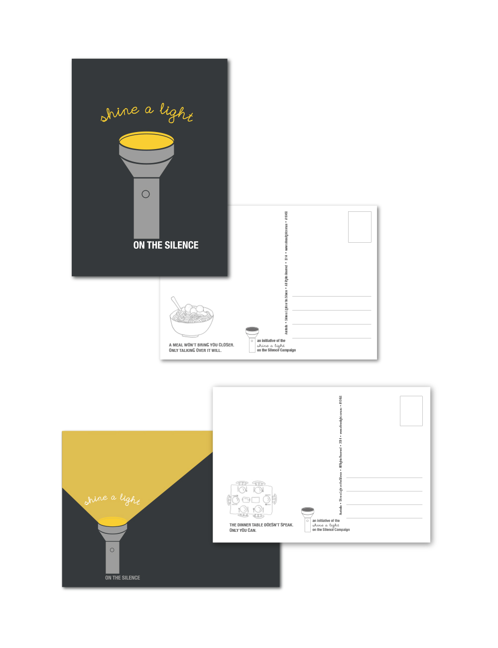A variety of supporting material is included in the campaign, which reiterates the main message of the campaign all with the aim of raising awareness. This support material includes postcard style flyers, which were chosen for their compact format and practical use. These postcards would be free promotional items that people can have the option of keeping and using for writing a letter at a later date. A tshirt series and promotional stickers are also part of the campaign, chosen for their aesthetic value with the aim of increasing the initial interest in the campaign. Both the tshirts and stickers are created using glow-in-the-dark ink. This again reiterates the message of “shining a light”, while also being a fun and quirky point-of-difference that keeps viewers engaged.