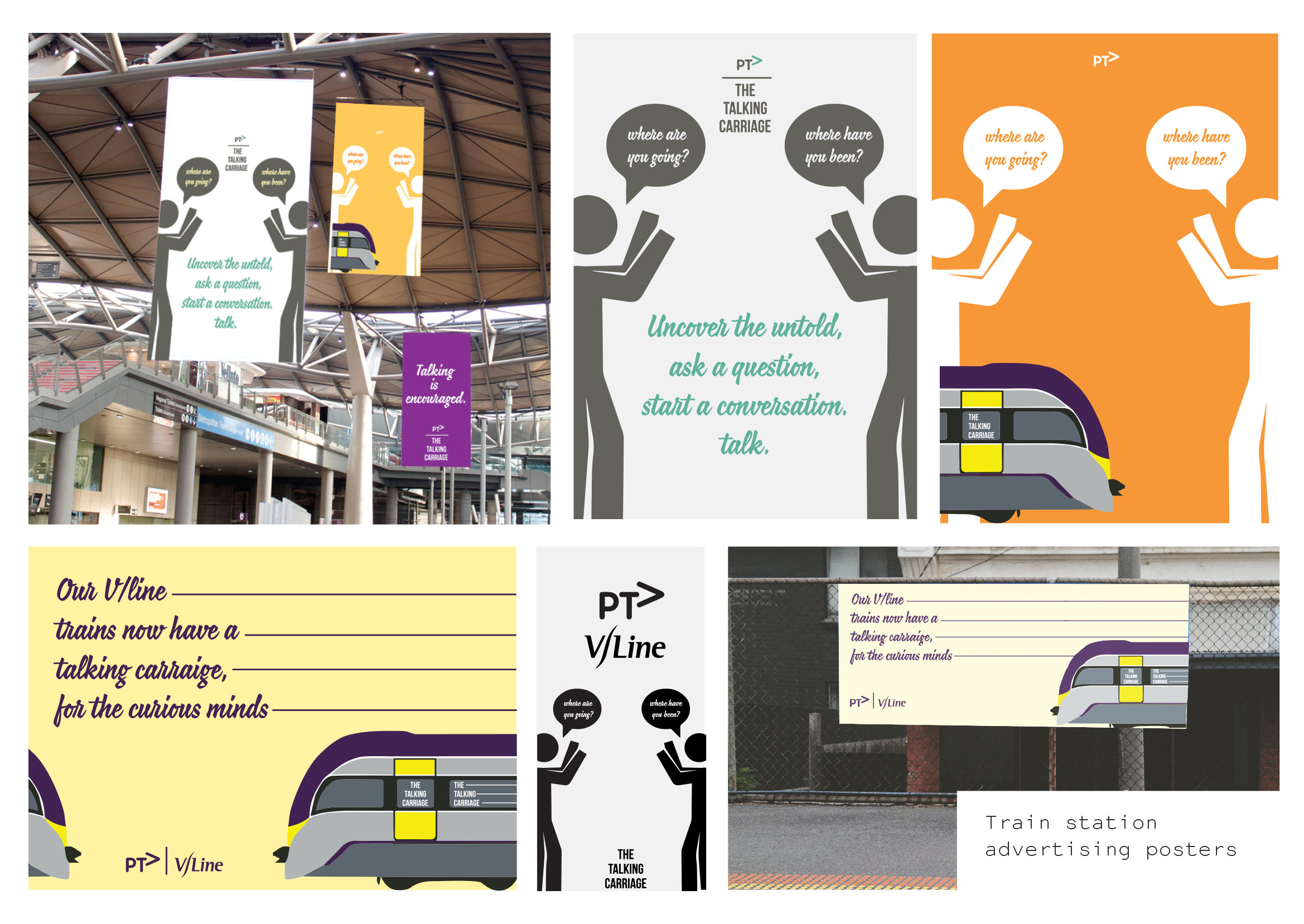 My communication approach includes the use of graphic signage on regional trains, in big city train stations and in the rural spaces. The communication on the signage includes casual quotes promoting the idea of talking to the people close by to you and also the idea of people “uncovering the untold” which is a nice casual approach again for people to start communicating.