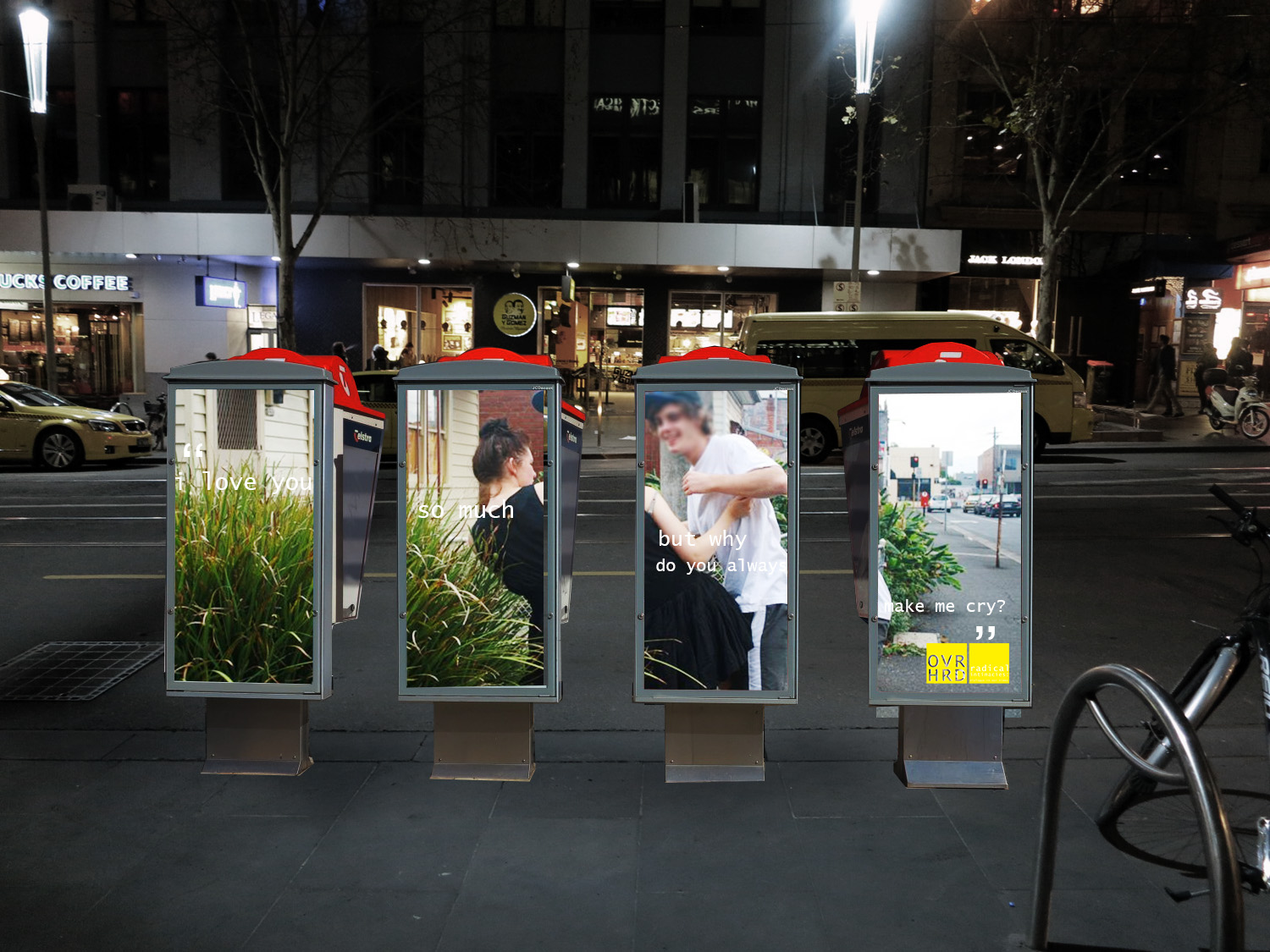 Inspired by the guerrilla advertising initiatives by underground street artists, I wanted to take a similar approach of taking over a public space. In a painstakingly boring act of seeking honest, valuable content – the quotations you see in each installation are real. I eavesdropped on conversations being had at these payphones and took notes. The activity didn’t yield the most enlightening material as fast as I thought it would, but it didn’t matter: it was honest. I wanted to take a raw, literal approach. Also bear in mind I'm a business student, not a design student.