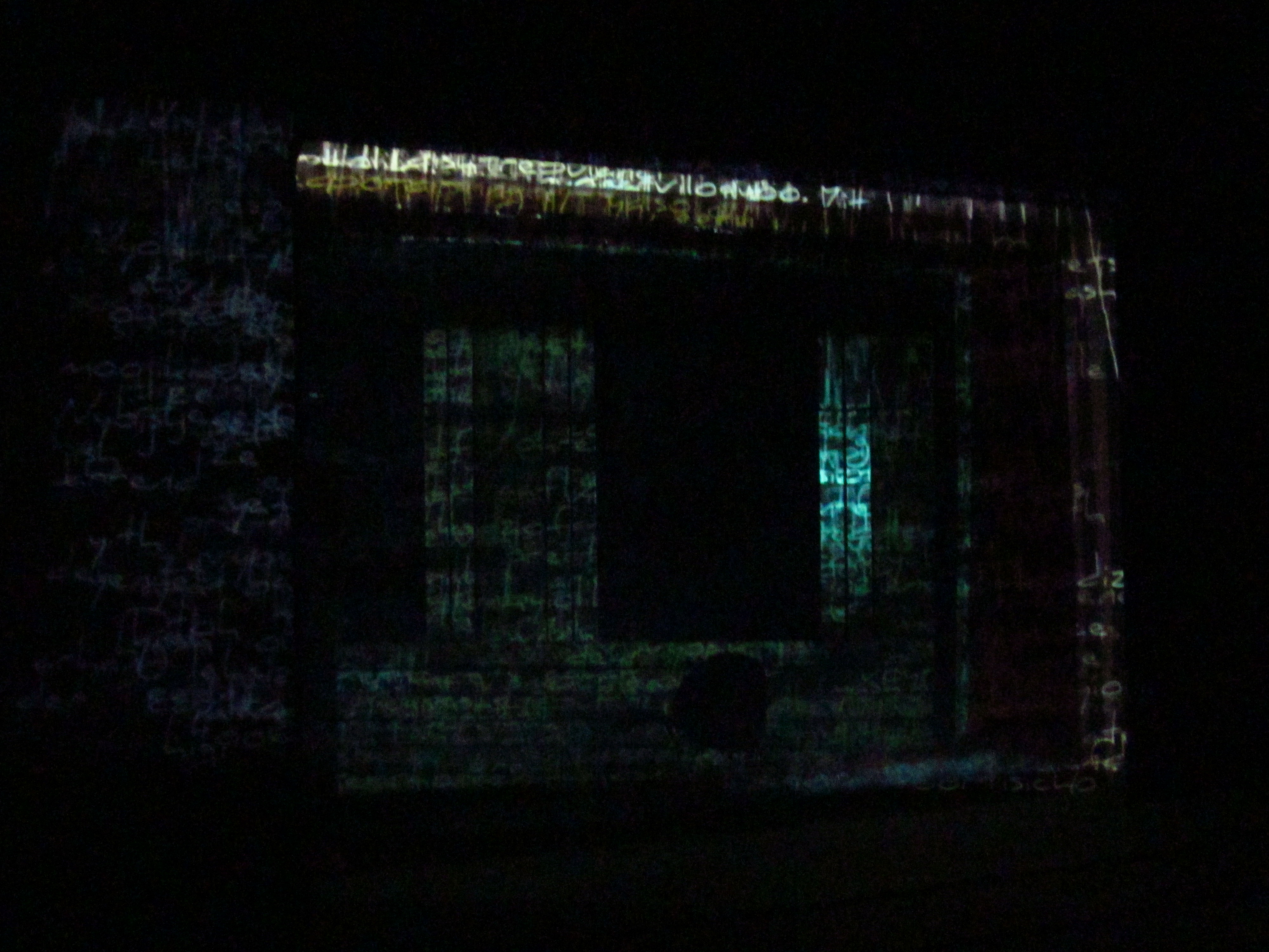 My work "EnkrrOach" takes the recognizable Roman characters and creates a generative visual of a string of nonsensical text. The projection is a rapid and continuous placement-over-placement and disappearance of gibberish. The accompanying audio is also illegible, non-understandable, and yet it communicates through the tonal modulation, the loudness, the whispers, the pauses. It was originally projected over a set of two glass windows in the dark.