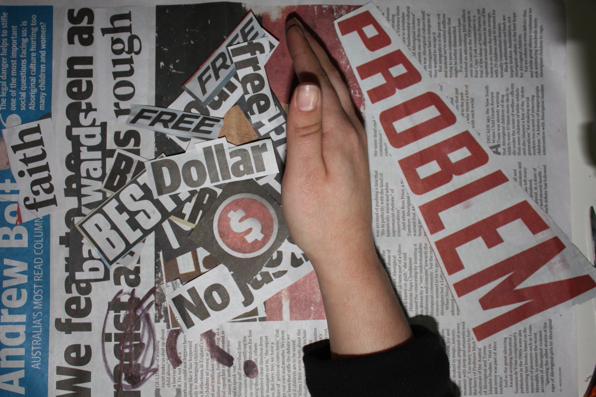 The driving factor behind selecting stop-motion animation is to highlight the intricate and numerous levels of alteration that is made from real life events. In the “inflection/infection scene” I have removed a letter to create a completely different meaning of the word. I would like viewers to associate the scene with the concept of it being impossible to document wholesome events in all aspects of their entirety. Even if one has experienced an event firsthand, we all uphold various, beliefs, values, identities and past experience that will affect our understanding and response to the same occurrence. It would also be quite difficult to documents entire events; that including the events leading up to, aftermaths and also the emotions of each individual involved and affected. Furthermore in using re-arranged newspapers and text, this brings connotations to criminal behavior such as ransom notes. I would hope that this leads the viewer’s awareness to the motives behind commercial journalism. This being that many newspapers try to uphold brand values and a certain image. Censorship is applied true information altered in order to appeal to certain values and emotions in the reader.