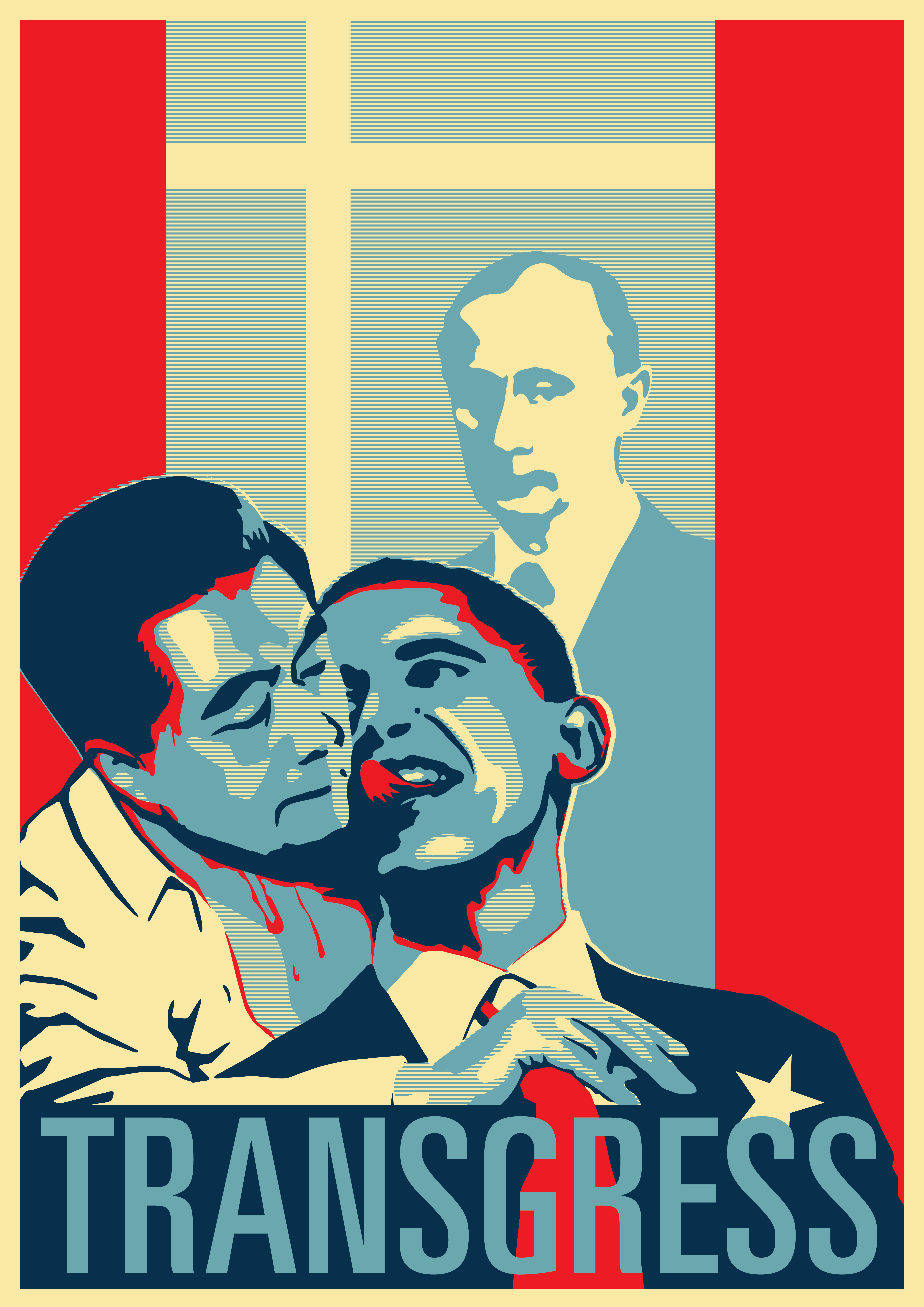 It reminds me of the slogan "Make love not war" as if that would solve all the worlds problems including population growth. The work does represent critical reflection of a global political space and it gets its strength from the original Obama poster we all are so familiar with from the last US elections.