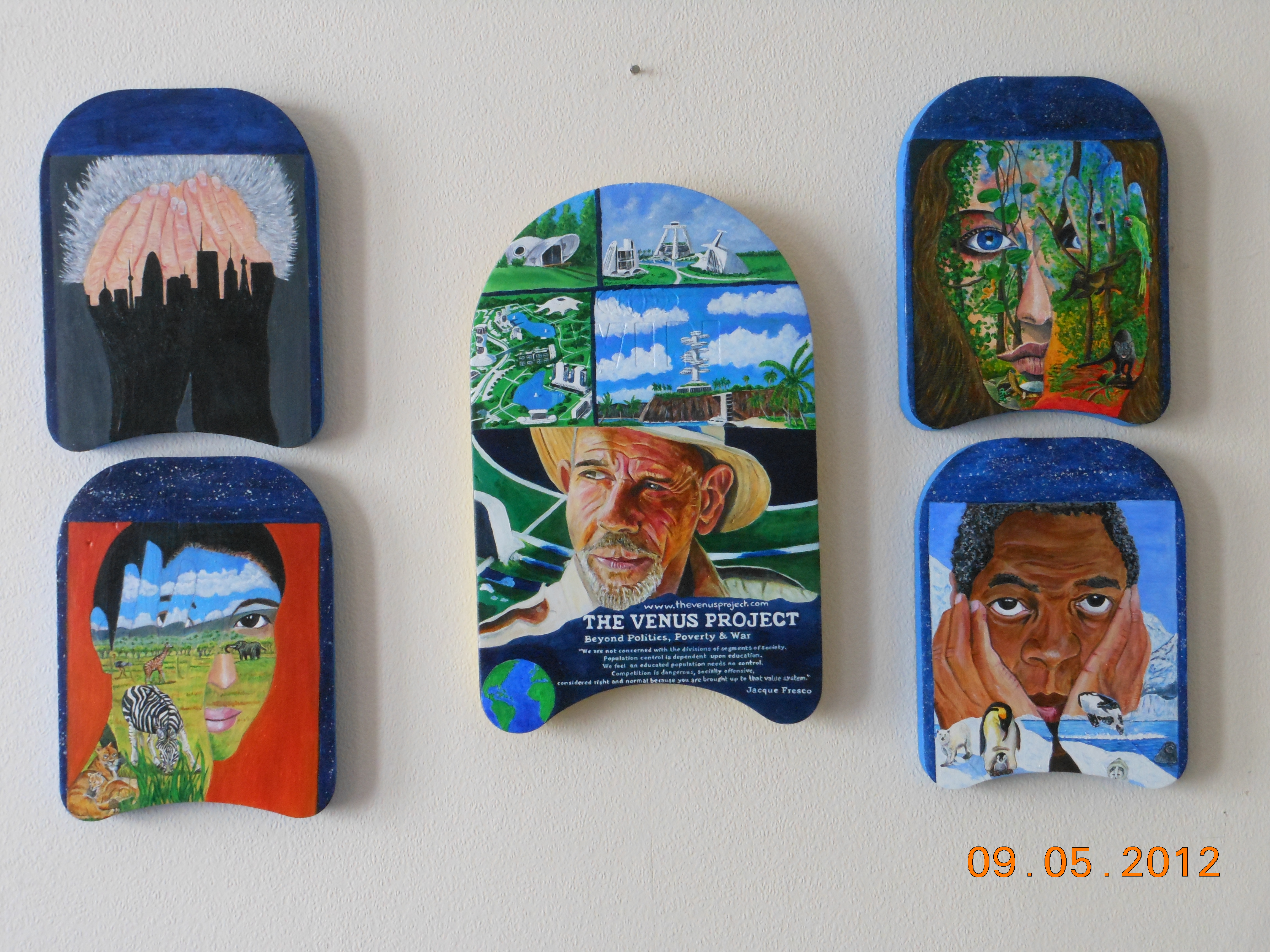 Use acrylic paints on consumer waste. These were done on 4 swimming floats being thrown away by a "health spa" in a large hotel where I am at the moment. Went to ask for one more to complete the series and was told that they didn't have any but were going to order some!!